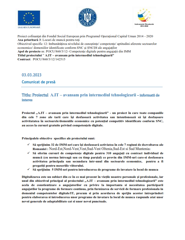 Titlu: Proiectul "A.IT – avansam prin intermediul tehnologizarii"